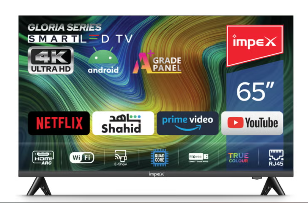 امبيكس تلفزيون LED ذكي بنظام اندرويد ومنفذ HDMI USB وواي فاي ونتفليكس وشاهد ويوتيوب وديزني بلس وابل تي في وستارز بلاي ارابيا ضمان لمدة عامين جلوريا 65 أسود