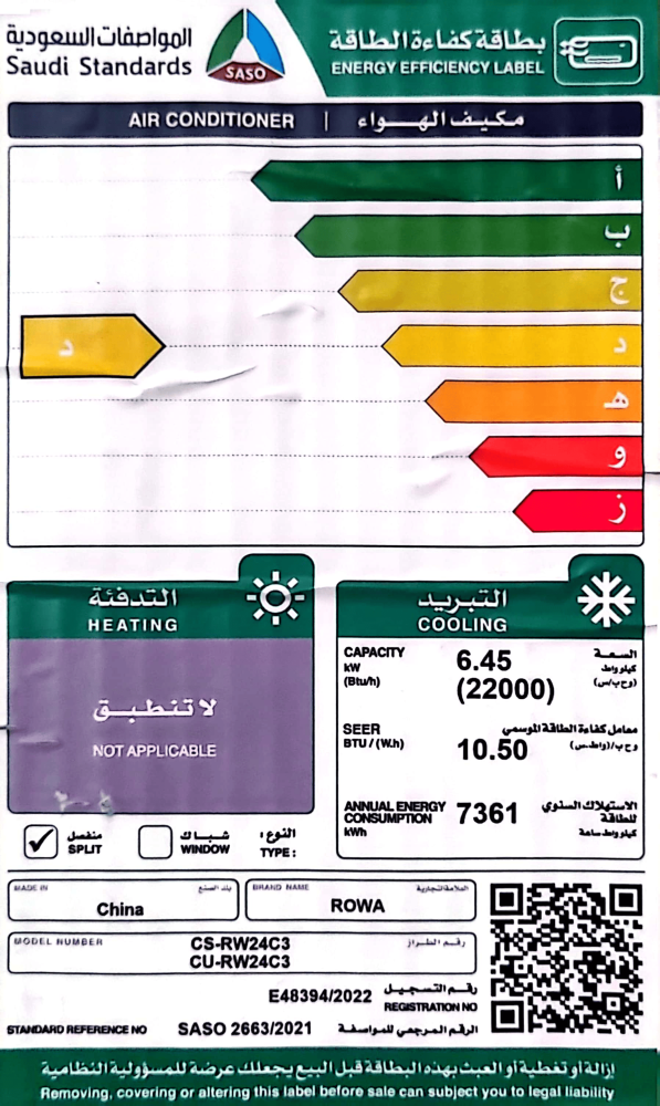 - القدرة الفعلية للتبريد: 24000 وحدة.