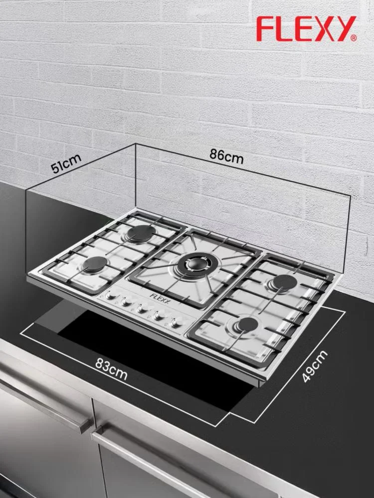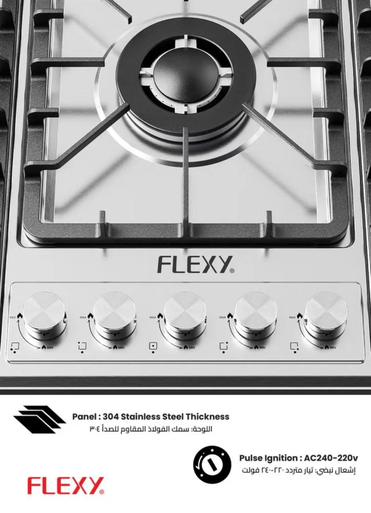 🔥 تصميم عالي الأداء بخمس شعلات لطهي متعدد الاستخدامات يتميز موقد الغاز المدمج FLEXY®️ بخمس شعلات عالية الطاقة، مما يتيح لك طهي أطباق متعددة في آنٍ واحد بدقة. مزود بموقد ووك ثلاثي الحلقات قوي بقوة 3.3 كيلوواط لتسخين قوي، وموقد سريع بقوة 3.0 كيلوواط للطهي السريع، وموقدين شبه سريعين بقوة 1.75 كيلوواط لتسخين متوازن، وموقد إضافي بقوة 1.0 كيلوواط للطهي على نار هادئة. صُمم هذا الموقد الغازي للتعامل مع جميع الاستخدامات، من القلي على نار عالية إلى الطهي البطيء. مثالي لطهاة المنازل وعشاق الطهي، حيث يوفر أداءً احترافيًا بتصميم أنيق مدمج.